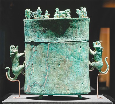 贮贝器是滇文化最具代表性的器物之一。“云南地区的青铜文明”单元展示了李家山贵族墓地出土的西汉驯马场面铜贮贝器、纺织场面铜贮贝器等。驯马场面铜贮贝器整体为圆筒状,腰微束,平底下有3个扁平足,器身两侧铸对称立体虎形耳。圆形盖上铸10人7马,分为8组,生动表现了滇人在头领的监督下集体驯马的场景,似为供奉驯化和驾驭烈马、蛮牛的“御神”。