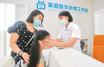近年来,浙江省嘉兴市不断统筹城乡医疗卫生一体化发展,一个集预防、医疗、保健、康复等服务于一体的“15分钟医疗卫生服务圈”建成。图为8月6日,在嘉兴市南湖区东栅街道社区卫生服务中心“家庭医生助理工作站”,工作人员正在为小朋友查体。