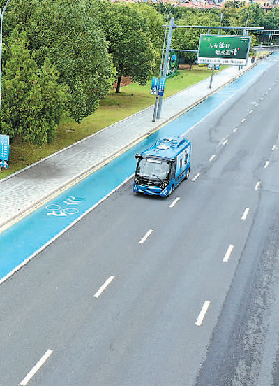 浙江省湖州市德清县武康街道自动驾驶亚运公交环线上,自动驾驶巴士在行驶中。 |