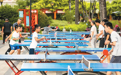 8月8日,在山东省滕州市弘道公园内,市民正在打乒乓球。 |