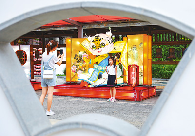 近年来,山东省青岛市李沧区打造沉浸式、体验式、互动式的消费场景,深入挖掘旅游消费潜力,打响“旅游青岛、购物李沧”品牌。图为游客在山东青岛世博园国潮赏灯会景区内拍照打卡。 |