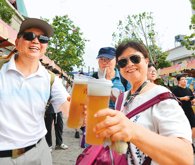 近日,山东青岛举办第二届上街里·啤酒节,推出消暑休闲美食之旅,拓展消费空间,丰富群众的业余文化生活。图为游客体验青岛原浆啤酒。 |