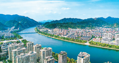 从空中俯瞰,“八山半水分半田”的分水镇被群山环抱,分水江穿城而过,城镇、工厂、民居等沿江散布。
