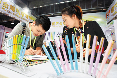 在分水镇举办的中国笔业博览会上的一家制笔企业展台。 |