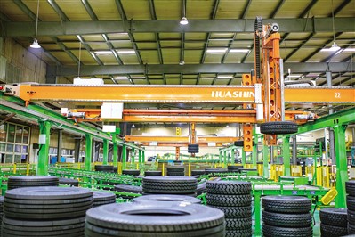 7月3日,在山东省东营市广饶县的一家获得“国家级绿色工厂”称号的橡胶轮胎制造企业,智能堆垛机正在紧张地分拣作业。 |