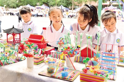 5月23日,安徽省合肥市金湖小学的学生在展示自己用废弃物品创作的百变吸管作品。 |