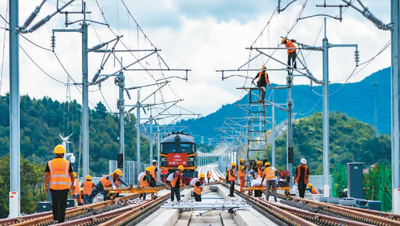 池黄高铁位于安徽省皖南山区,是武汉至杭州高速铁路通道的重要组成部分,线路起自池州站,至黟县东站与在建昌景黄高铁共站并线至黄山北站,新建正线长约125公里,设计时速350公里。目前,池黄高铁接触网、电力变电、通信、信号等四大专业的电气化施工已全面展开。图为近日,池州市青阳县蓉城镇牌楼村,工人在新建池州至黄山高速铁路九华山站段安装电力设备。