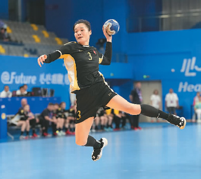9月24日,中国队球员张海侠在女子手球比赛中射门。 新华社记者 孟永民摄