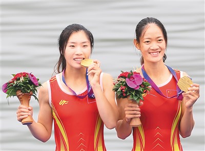 9月24日,中国组合邹佳琪(左)/邱秀萍在颁奖仪式上。 新华社记者 杜潇逸摄