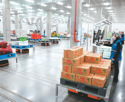 湖北省襄阳市好邻居生鲜物流中心AGV智能机器人分拣系统接到订单后,对订单综合分析,可将货品的名称、货位编码以及最优线路发送给机器人,由机器人出货,帮助员工快速精准地将货品配齐,确保生鲜的新鲜程度,满足消费者即时性、便利化的消费需求。图为在好邻居生鲜物流中心,机器人根据工作人员指令穿梭于货架之间,自动分拣蔬菜、水果等生鲜产品。 |