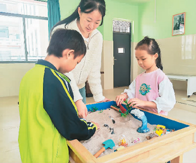 10月10日,湖南省永州市江永县潇浦镇芙蓉学校的心理教师在心理辅导室和学生一起摆放沙盘。 |