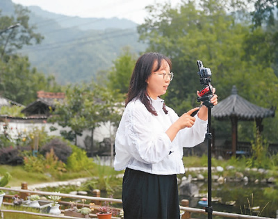 陕西省汉中市留坝县以打造全域旅游为重心,借助秦岭优越的自然环境,通过对村民闲置老屋进行改造提升,打造特色民宿集群,助力乡村振兴。图为在留坝县紫柏街道大滩村云山阅民宿内,工作人员进行线上直播推介。 |