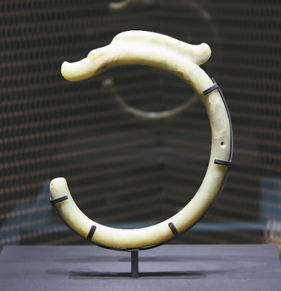 发源于西辽河流域的红山文化距今6500年至5000年,以种类丰富、雕刻精美的玉器闻名于世。这些玉器大多作为随葬品出现,具有宗教、祭祀意义。龙形玉器是红山文化的代表性玉器,一种是C形玉龙,另一种是玉猪龙。此次展出的故宫博物院藏红山文化玉龙由一整块黄绿色闪石玉雕琢而成,龙身弯曲成优美的虹形曲线。玉龙头部雕刻出梭形长眼、长而前凸的吻、上翘的鼻等,脑后长鬣飘逸,龙身中部有穿系孔。据介绍,这件玉龙是目前所见最大的一件C形玉龙。