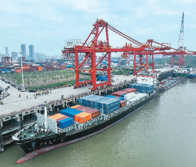11月15日,“华航汉亚6”货轮从武汉阳逻港出发,满载化肥、元明粉等货物,共计装载268标箱,驶向越南凯莱港。这将是湖北港口集团汉亚班轮开行4年来首次抵达东南亚。图为货轮准备起航。