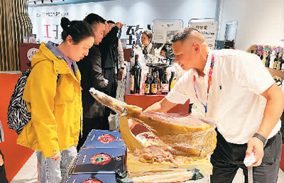 青田侨商、浙江欧莱进出口有限公司董事长徐东勇与妻子卓清丽,在西班牙从事进出口贸易已有20多年。自2018年第一届侨博会起,他们每年都会带来西班牙的特色商品。本届侨博会上,他们的“哈蒙”和红酒产品展位前咨询订购的客流不断,多种规格包装的切片“哈蒙”吸引许多消费者品尝、下单。