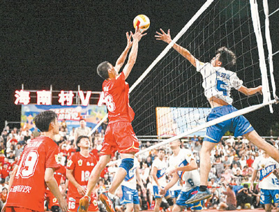 在被称为“村排”的2023年海南(文昌)乡镇排球联赛决赛中,东郊镇队(右)对阵东阁镇队。 |