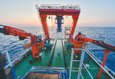 由国家文物局考古研究中心、中国科学院深海科学与工程研究所等联合组成的深海考古队搭乘“探索一号”科考船,在南海西北陆坡一号、二号沉船遗址海域进行第一阶段调查。该科考船载有“深海勇士”号载人潜水器,用于水下考古数据采集。图为“探索一号”科考船行驶在南海西北陆坡一号、二号沉船遗址海域。 |