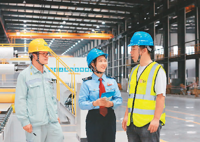 今年以来,广西壮族自治区来宾市税务部门积极引导青年干部深入改革前沿和服务一线调研,通过税收数据深度利用、“一户一册”定制化专项服务等方式,让各项税费优惠精准直达,更好惠及市场主体,助力企业轻装上阵。图为青年税务工作者日前到来宾环球经典新型建材有限公司开展政策辅导。