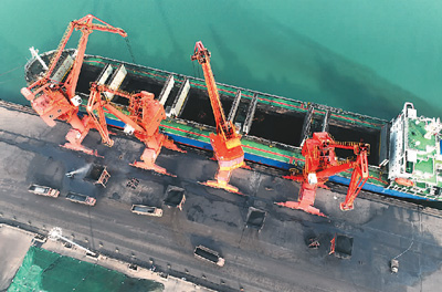 连日来,江苏连云港港加快冬季电煤运输和储备,全力保障发电企业供暖用煤需求。图为11月22日,货轮在连云港港煤炭码头卸载电煤。 |
