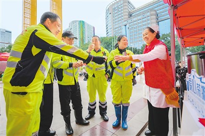 12月4日,在福建省福州市鼓楼区,“爱心茶摊”的志愿者们为环卫工人送上驱寒的姜茶。 |