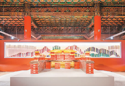 “汇流澄鉴:故宫出版社建社四十周年展”现场,由故宫出版社出版物堆成的“故宫书山”和“紫禁书城”。 |