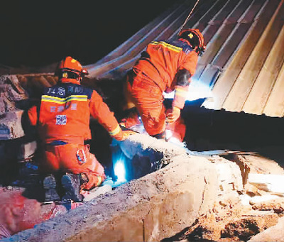 消防人员在甘肃省临夏回族自治州积石山县大河家镇开展救援。 |