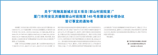 经厦门市同安区洪塘镇人民政府、厦门火炬园林市政有限公司于2023年5月9日、2023年5月14日、2023年5月19日在《厦门日报》刊登该房屋的商谈征收补偿事宜的通知后,145号房屋的使用人或代理人沈玉英、郭进于2023年5月20日持《乡村建房宅基地许可证》(证号:许字第52680号)、承诺书、委托书前来主张该房屋的权益,并要求由其签订房屋征收补偿安置协议书。现拟与其签订房屋征收补偿协议书,补偿方式为货币化补偿(房票补偿),金额人民币(大写):叁佰伍拾玖万叁仟陆佰肆拾壹元玖角柒分(¥ :3593641.97元)。请未接到书面商谈通知书或对该房屋征收补偿事宜存在异议的相关权益人(产权人、继承人、代管人等利害关系人),于本通知书刊登之日起三个月内,携带相关材料到“同翔高新城片区E项目(郭山村前院里)”同安区洪塘镇埔后村埔后里199号二楼征迁工作点主张该房屋的权益,逾期无人主张权益的,将由房屋使用人或代理人沈玉英、郭进签订该房屋的征收补偿安置协议书,并给予货币化补偿(房票补偿)。