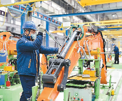 山东省烟台市实施企业倍增计划,推进“9+N”制造业集聚培育工程和16条重点产业链强链、补链和延链,以赋能先进制造业高质量发展。图为位于烟台市的现代迪万伦工程机械有限公司内,工人在流水线上生产挖掘机。 |