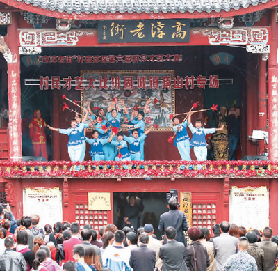 花山村(原为蒋山村)村民来到南京市高淳区高淳老街表演打莲湘。 |