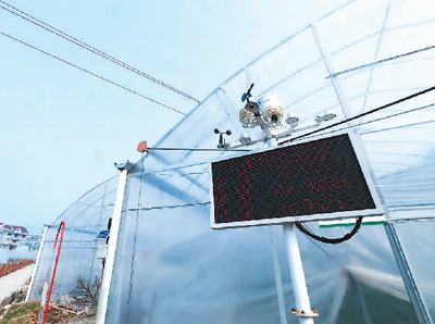 在浙江省建德市杨村桥镇的草莓种植大棚外,实时显示各类气象数据。 |