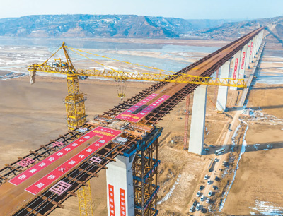 1月26日,临猗黄河大桥主桥钢箱梁在山西省运城市顺利合龙。该桥全长5427米,主桥采用等高度连续钢箱组合梁,从山西、陕西两侧顶推平台对向顶推施工,是国家高速公路菏宝线G3511的控制性节点工程。