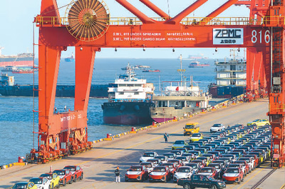 江苏太仓港是长江集装箱第一大港、长江外贸第一大港。图为太仓港远洋巨轮频繁进出,新能源汽车等待装船外运。 |