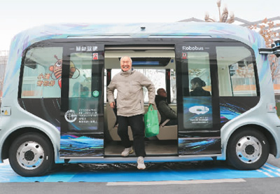 日前,浙江省湖州市德清地信小镇智能驾驶景区公交正式投入使用,给市民带来更智能、更高效、更便捷、更顺畅的出行体验。图为一名乘客从无人驾驶公交车上下车。 王树成摄(人民视觉)