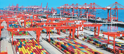 江苏省苏州港太仓港区,集装箱吞吐作业繁忙有序。 |