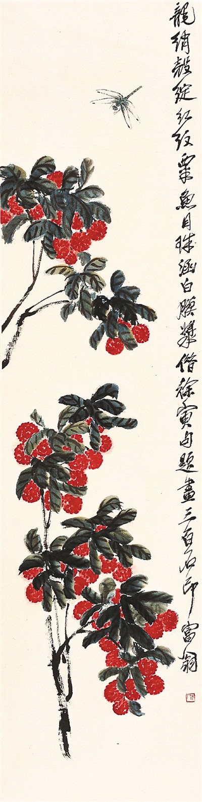 此次展出的《荔枝蜻蜓》堪称齐白石工细草虫配以写意花卉的经典之作,用西洋红点染累累荔枝果,复以湿墨勾出数枝,焦墨写就叶片筋脉,以浓淡表达明暗层次。画面右上画一尾蜻蜓,似闻香而至,为点睛之笔,蜻蜓比例刻画精准,在墨色的晕染下,浓淡富有变化。蜻蜓与荔枝组合,也寓意“青云大利”。