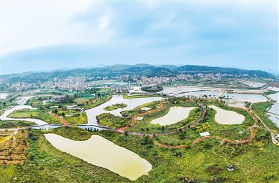 三月十五日,广西梧州市苍海国家湿地公园内的步道与河流、湖泊、田园、民居等相映成景,美不胜收。