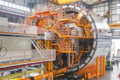 位于佛山市顺德区的中铁华隧联合重型装备有限公司盾构机生产车间内,工人在安装超大型盾构机部件。 |