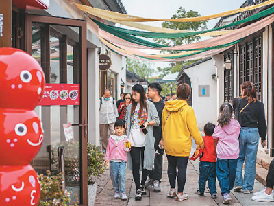位于上海虹桥商务区的蟠龙天地是上海首批城中村改造项目,项目建成后不仅丰富城市文化休闲生活,更助推区域水岸经济、夜经济活力释放,吸引不少市民前来体验。图为市民在蟠龙天地游玩。 |