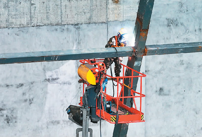 工人在焊接广西玉林北站站房的钢梁。 |