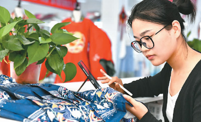 在山东曹县安蔡楼镇有爱云仓汉服基地,设计师梁莉在设计马面裙绣花图案。 |