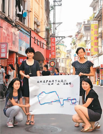 2012年夏季,厦门大学新闻传播学院的师生以“文化遗产视角下的厦门”为主题,分别对该校历史建筑群和厦门的“环岛路”“中山路”“第八菜市场”进行了遗产价值要素提取实践;同时,也依照遗产传播的特点规划了体验产品。图为中山路实践小组在现场展示她们的“遗产小道”规划成果。 |