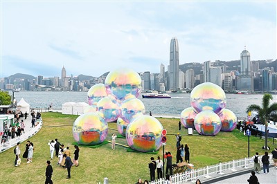 近日,香港西九文化区展出大型艺术装置“抱泡瞬间”,耀眼泡泡的外观随日照变化,融入香港维多利亚港醉人景色,吸引众多市民前来拍照打卡。
