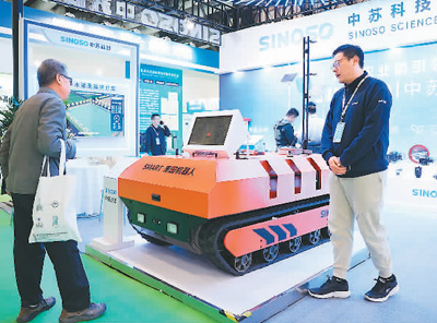 3月31日,第十届北京国际数字农业与灌溉技术博览会在北京国家会议中心开幕。本届展会以“新制造 新服务 新业态”为主题,为现场观众展示了大量数字农业与灌溉技术领域的先进装备与技术。图为参观者在了解一款果园植保机器人。