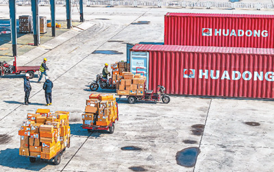 山东省荣成市石岛管理区通过推广“海运直航+跨境电商+海外仓”等发展模式,稳步开拓多元化国内国际市场。目前,石岛新港口岸已成为中外客商认可的跨境电商重要中转港。图为石岛管理区石岛新港口岸一处场站,工人在分拣、装运货物。 |