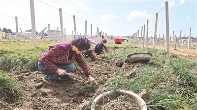 不久前,涪城村村民在地里挖麦冬。旁边的水泥柱就是用来套种苦瓜等藤蔓植物的。 |