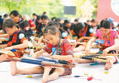 在海南三亚的黎锦、苗绣技艺竞赛上,青少年选手编制黎锦。 |