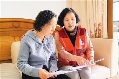钱芷芳(右)向邻里宣传“宁静小区”建设。 |