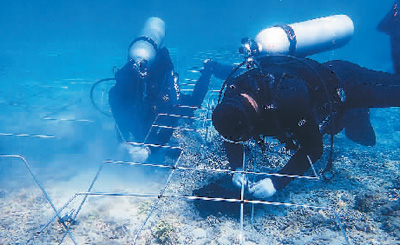 王爱民所在科研团队的成员在海南三亚的蜈支洲岛海域海洋牧场种植珊瑚。 |