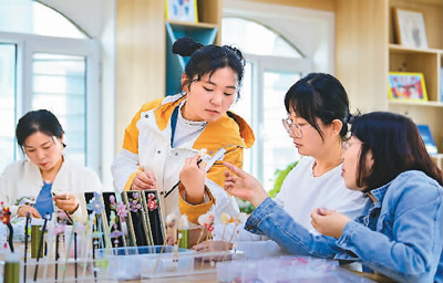今年以来,内蒙古自治区鄂尔多斯市康巴什区滨河街道办事处兴旺社区设立“巧手工坊”,聘请民间手工艺品制作能人担任教师,向农牧民妇女提供手工艺品制作技能培训服务,让400余名农牧民妇女在家门口实现就业增收。图为学员在社区“巧手工坊”交流手工艺品制作技艺。