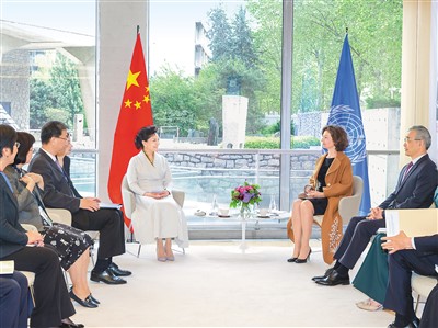 当地时间5月6日上午,国家主席习近平夫人、联合国教科文组织促进女童和妇女教育特使彭丽媛在巴黎应邀参访联合国教科文组织总部并会见阿祖莱总干事。 |